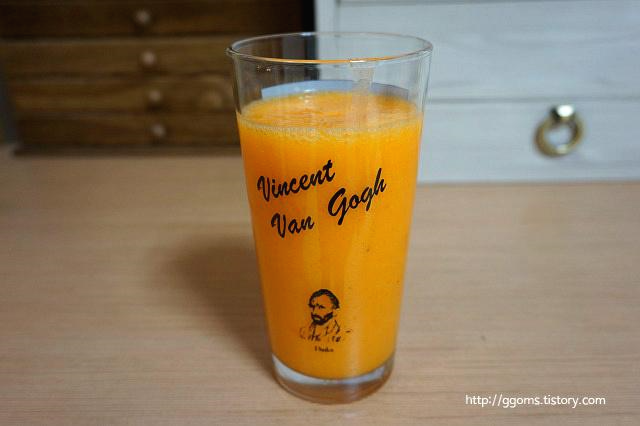 그렇게 해서 완성한 주황빛의 홍시주스, 색깔이 너무 예쁜 것 같아요.