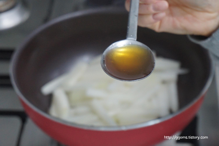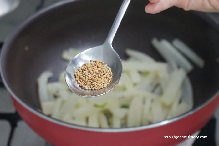그리고 불을 켜고 참기름을 넣어 볶아줍니다.
