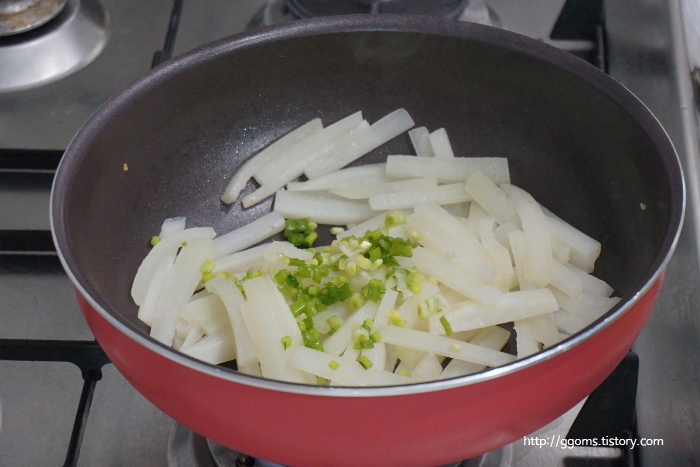 팬에 채썬 무 넣고요.