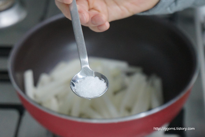 양념을 이것저것 하지 않고 소금만으로 간을 해 깔끔한 맛입니다. 요즘 무가 달고 맛있어 별다른 양념 없이도 맛있는 것 같아요.