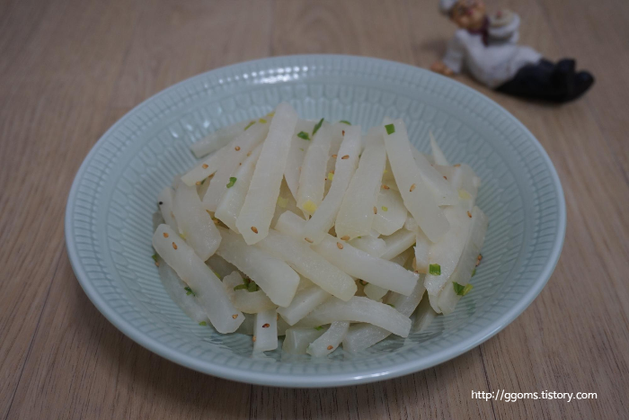 무토막, 참기름 1.5스푼, 소금 1티스푼, 물 1/2컵, 송송 썬 쪽파 1.5스푼, 통깨 1/3스푼