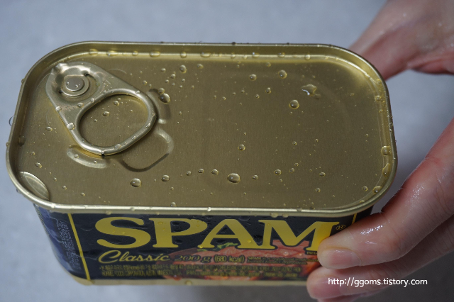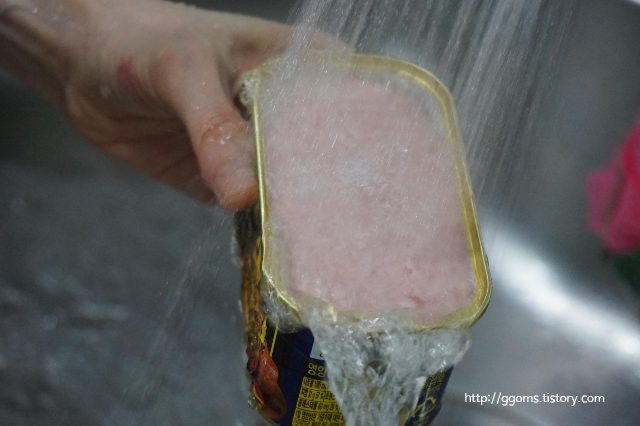 그렇게 물이 들어가게 하는 이유는 스팸통에 기름기가 굳은 상태로 달라붙어 있어 잘 안 빠지는데 물이 통조림 틈으로 들어가게 하면 기름이 씻겨져 공간을 만들어 주기 때문이에요. 따라서 스팸이 쉽게 빠질 수 있는 것이지요.