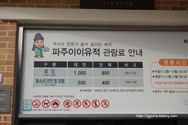 입장권을 구입해 들어가면 됩니다. 파주 이이 유적 관람료는 성인 1,000원, 30인 이상 성인 단체는 800원, 청소년은 500원, 10인 이상 청소년 단체는 400원, 6세 미만 유아, 65세 이상, 국가유공자, 장애인은 무료입니다.