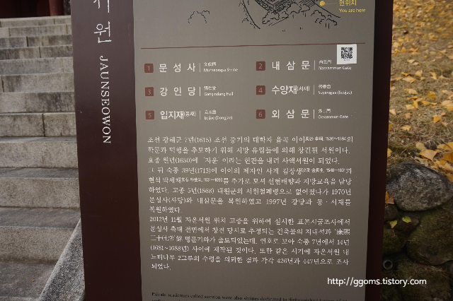 자원서원에 대한 설명이에요. 자원서원은 광해군 7년 1615년에 율곡 이이의 학문과 덕행을 추모하기 위해 지방유림에 의해 창건되었다고 합니다.