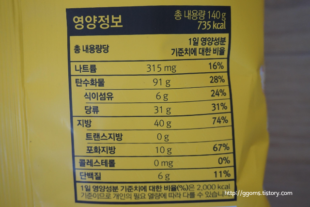 영양정보예요. 피코크 스윗&솔트 총 내용량 140g의 칼로리가 735kcal네요. 그리고 영양성분 중 지방 함량이 꽤 높습니다.