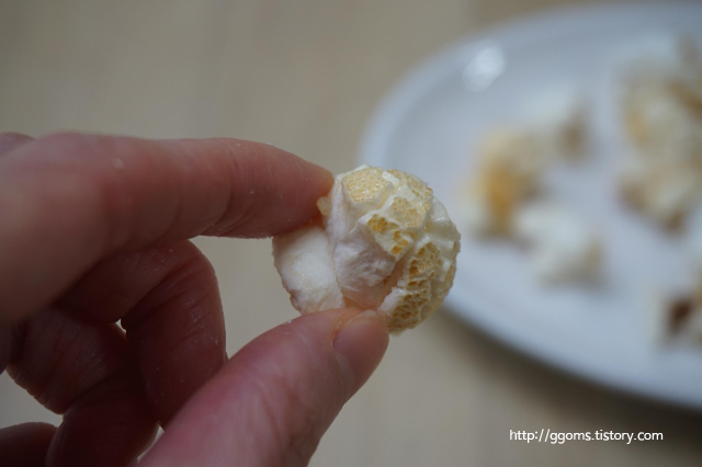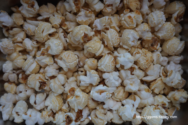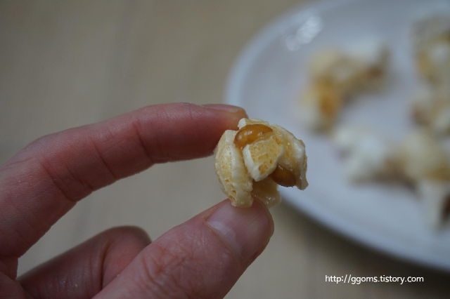 맛을 보니 반짝반짝 윤기가 있는 팝콘은 설탕이 코팅되어 달달하고요.