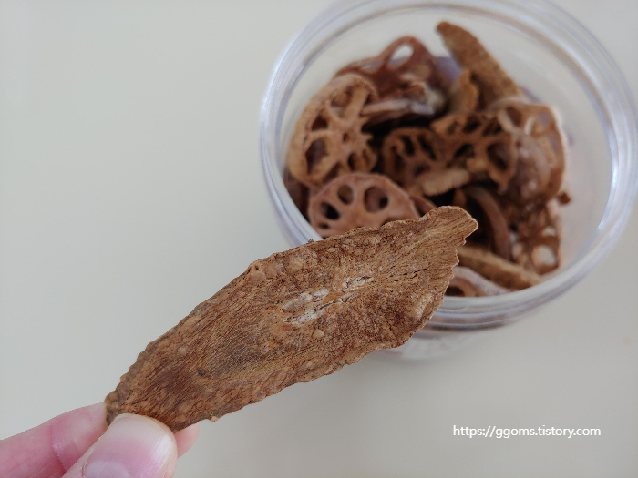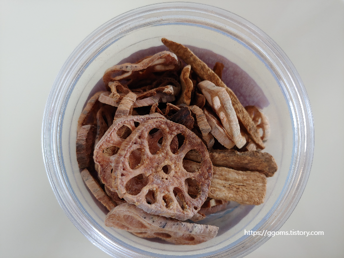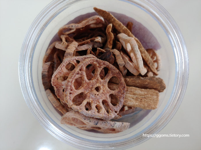 간편하게 먹으려고 티백차를 마시곤 했는데, 이것도 물만 끓여 티백 대신 원물만 넣으면 되니 티백차 못지않게 간편하네요. 게다가 상황에 따라 연근만 우려먹으면 연근차, 우엉만 우려먹으면 우엉차도 되겠고요. 어쨌든 연근우엉차는 녹차와 달리 카페인이 없으니 우려 놨다가 물처럼 마시면 좋을 듯합니다.