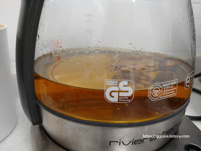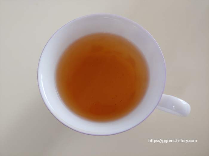 컵에 따랐어요. 물과 원물을 함께 넣어 끓이지 않고 그냥 따뜻한 물에 넣기만 하면 이게 우려지겠나 싶었는데 제법 잘 우려지네요.