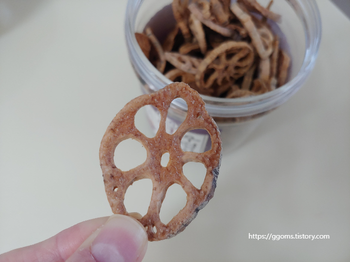 연근이에요. 연근 모양 그대로 구멍이 숭숭, 연근 테두리 검은점은 연근 고유의 무늬라고 합니다.