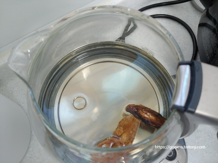 차 포트에 물 500ml 넣어 끓였어요. 그리고 뜨거운 물에 연근, 우엉 넣었습니다.