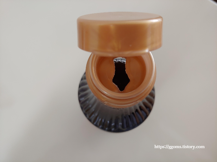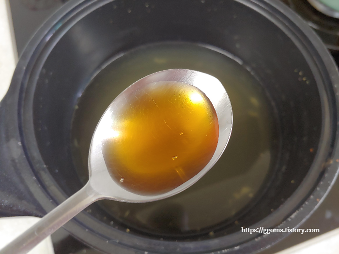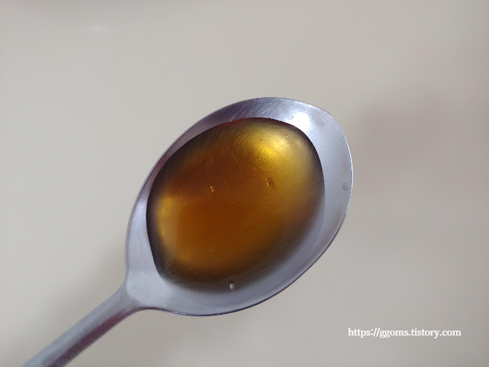 그리고 숟가락에 덜어내었어요. 갈색을 띠고 있고요. 찌꺼기 같은 것도 없고 맑은 편이네요.