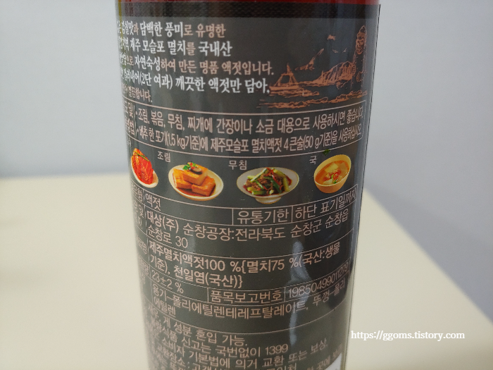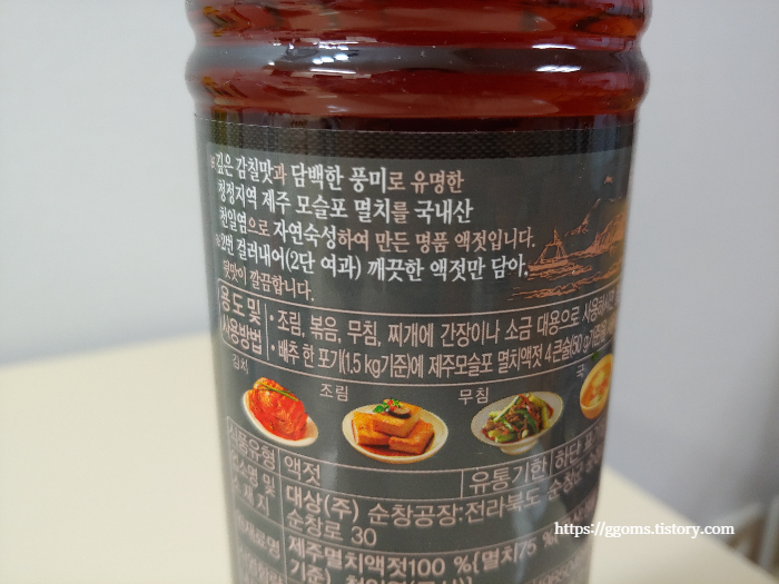 제품 특징은 제주 모슬포 멸치를 국내산 천일염으로 자연숙성하여 만든 액젓으로 2번 걸러내어 깨끗한 액젓만 담았다고 합니다. 용도와 사용방법도 적혀 있어요. 김치뿐 아니라 조림, 무침, 국, 볶음, 찌개 등에 국간장 등 간장이나 소금 대신으로 사용할 수 있습니다.