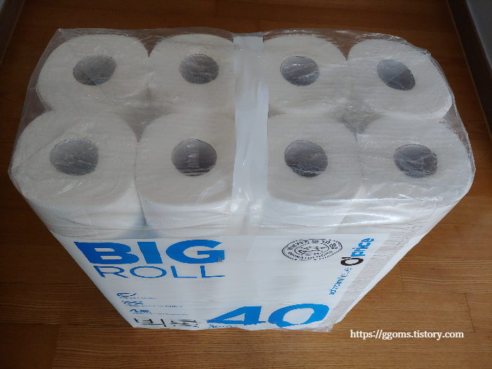제품은 이렇게 8롤이 5줄로 쌓여 있습니다. 합이 40롤이지요.