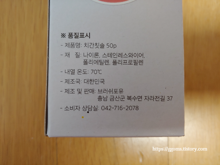 상자 뒷면에 제품 설명이 되어 있네요. 재질은 나일론, 스테인레스와이어, 폴리에틸렌, 폴리프로필렌, 내열온도는 70℃네요. 뜨거운 물에 소독하면 안 되겠지요.