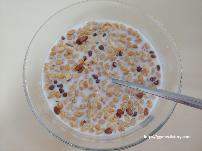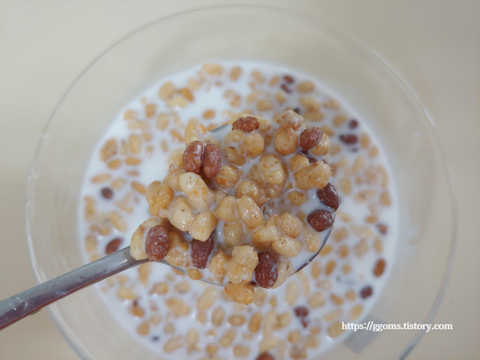 요거트에 넣어 먹어도 괜찮은 것 같고요. 그리고 그냥 과자처럼 먹어도 괜찮네요. 우유와 먹으면 포만감이 생기는 게 한 끼 식사대용으로는 그만인 것 같아요. 아침 식사 대신으로 먹으면 좋을 듯합니다.