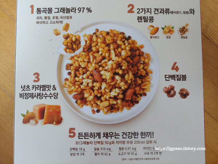 제품 특징은 통곡물 그래놀라 97% 함유, 통아몬드, 땅콩 같은 견과류와 렌틸콩, 넛츠 카라멜맛&비정제사탕수수당, 단백질볼이 들어 있는 게 특징이네요.