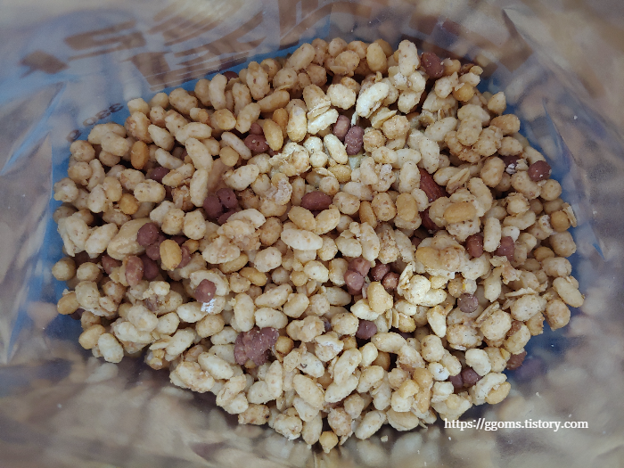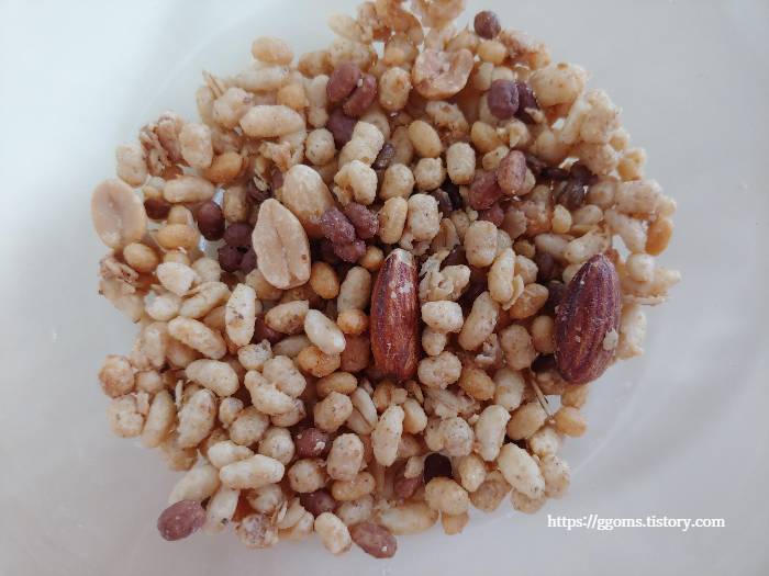 곡물 뻥튀기 같은 게 있고, 진한 갈색볼 같은 게 단백질볼, 그리고 통아몬드와 땅콩이 눈에 보입니다.
