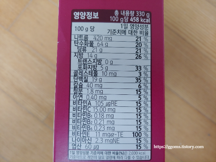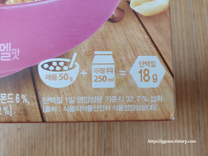 만약 제품 50g과 저지방 우유 250ml를 섭취 시 달걀 약 3개의 양과 같은 단백질 18g을 섭취, 단백질 1일 영양성분 기준치 32.7%를 섭취하는 셈이라고 합니다.
