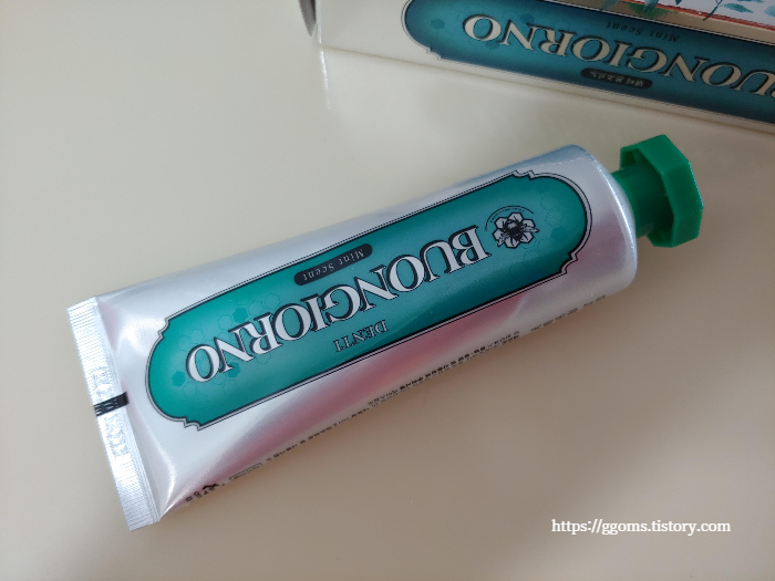 아토세이프 덴티본조르노 치약은 기능에 따라 잇몸케어, 구취케어, 치석케어로 색깔을 달리 해서 나뉘어 있는데, 이건 초록색의 구취케어로 구취제거에 도움이 되는 치약이에요.