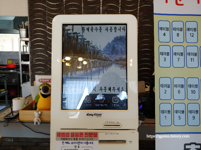 저희는 육전비빔밥을 먹어보기로 했고요. 주문은 테이블 번호 확인 뒤 키오스크로 주문하면 됩니다.