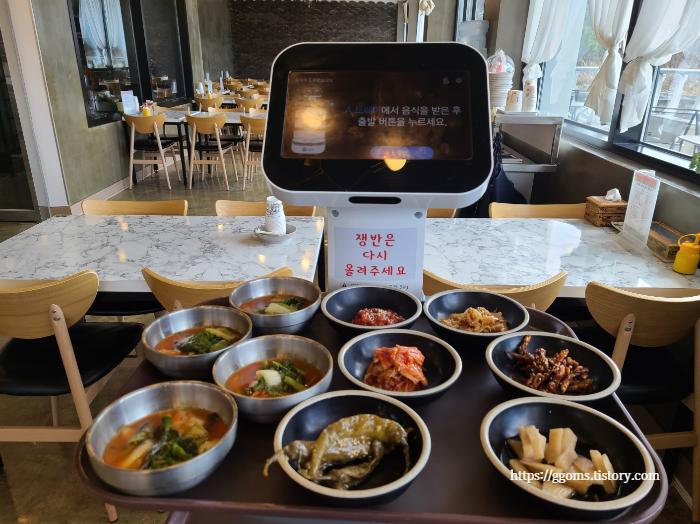 서빙은 로봇이 해요. 로봇이 밑반찬을 가지고 왔어요. 쟁반 위에 있는 음식을 테이블에 놓고 출발버튼을 누르면 됩니다.