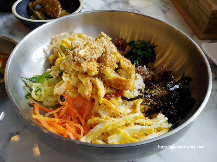 전체적으로 질긴 나물들이 없어 어르신들이 먹기에 좋을 듯, 부드럽게 씹히고요. 고추장 소스도 맵지 않네요. 어쨌든 비빔밥에 육전이 들어가는 게 특이하면서도 괜찮은 조합인 듯, 저는 육회는 잘 못 먹기에 육회 비빔밥인 경우 육회는 덜어내고 먹는데 이건 그럴 필요 없으니 좋은 것 같아요.