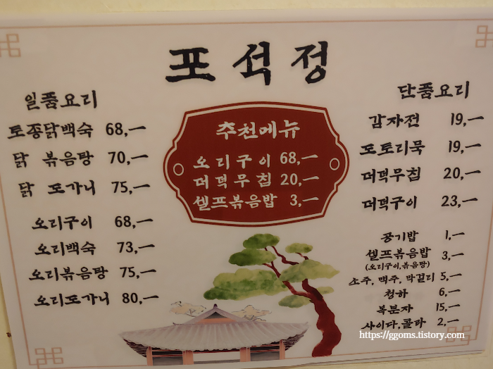 벽면에는 메뉴판이 있어요. 포석정 메뉴는 토종닭백숙 68,000원, 닭 볶음탕 70,000원, 닭 도가니 75,000원, 오리구이 68,000원, 오리백숙 73,000원, 오리볶음탕 75,000원, 오리도가니 80,000원