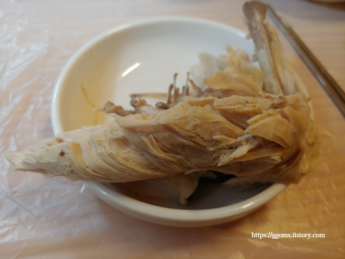 살코기를 뜯어서 소금에 찍어 먹었어요. 그런데 토종닭이라 그런지 살코기가 연하지는 않았어요. 살짝 질긴감이 있었습니다.