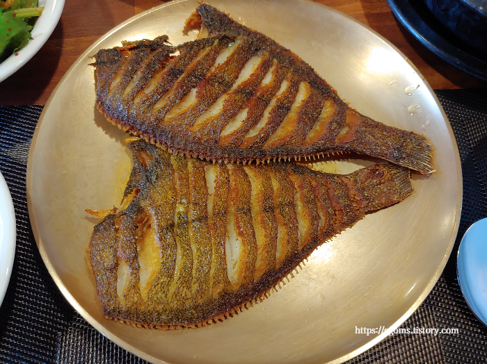 가자미구이, 튀기듯 나왔는데 간이 좀 짭짤했어요.