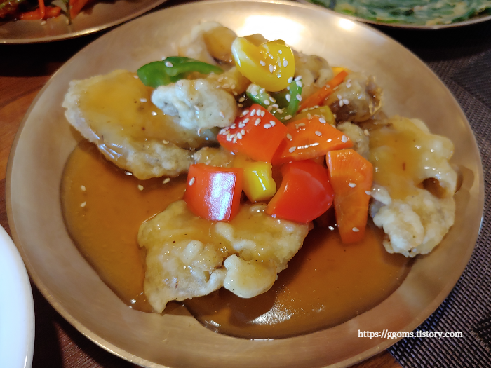 달콤한 소스에 바삭한 튀김의 표고버섯탕수, 처음에는 고기 탕수육인 줄 알았는데 버섯탕수더라고요.