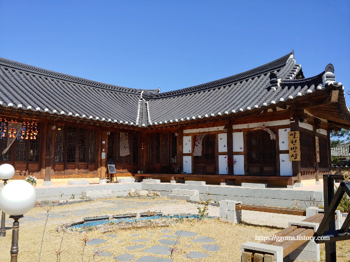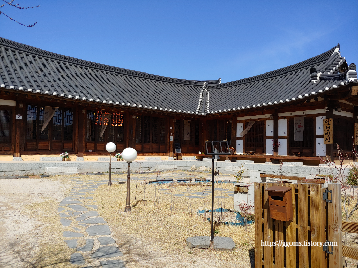 경주 알천반상, 주소는 경주시 교촌안길 7, 멋스럽게 한옥으로 지어진 식당이에요. 마당도 꽤 넓더라고요.
