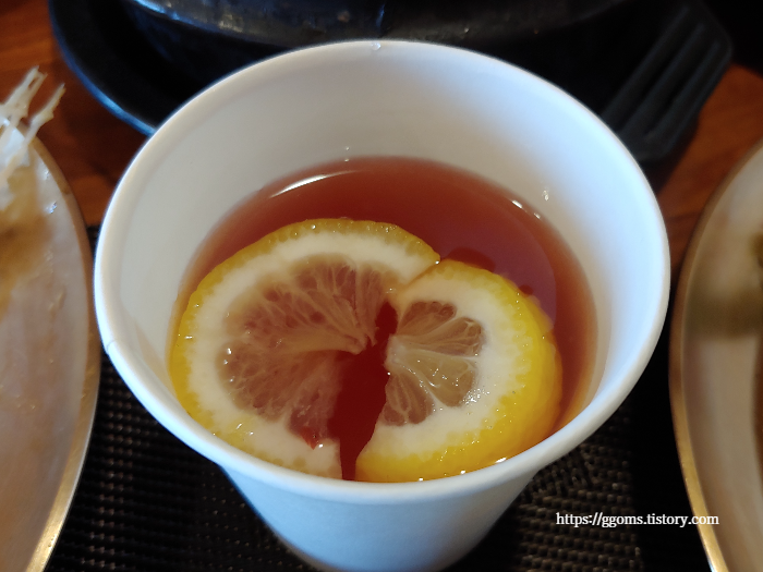 후식으로 차를 주셨는데요. 수제청차인 듯한데 무슨 차인지는 모르겠어요. 달콤하니 맛있었어요.