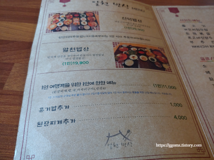 메뉴는 선덕밥상 1인에 29,900원, 알천밥상 19,900원, 1인 여행객을 위한 1인에 한한 메뉴 11,000원, 공기밥 추가 1,000원, 된장찌개 추가 4,000원