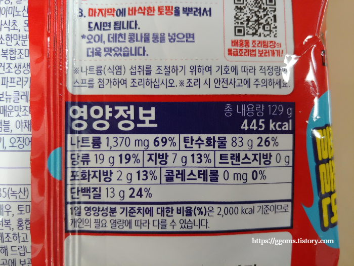 그리고 농심 배홍동 쫄쫄면 영양성분이에요. 칼로리는 445kcal이고, 나트륨 함량은 1,370mg, 탄수화물은 83g, 당류 19g, 지방 7g, 트랜스지방 0g, 포화지방 2g, 콜레스테롤 0mg, 단백질 13g이 들어 있네요.