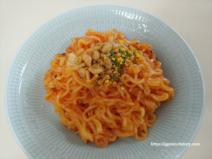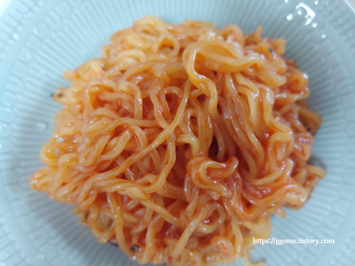 먹어보니 매콤달콤한데 매콤한 맛이 강하네요. 처음에 먹을 때는 잘 모르겠는데 먹다 보니 맵싸함이 더 느껴졌어요. 그렇다고 아주 못 먹을 정도로 매운 건 아니고요. 면은 쫄깃해요. 탱글하니 쫄면 식감이 나는 듯, 살짝 튀김 토핑이 씹히는 것도 재미있네요.