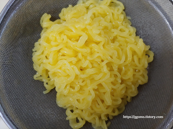 삶은 면은 냉수에 충분히 헹궈서 물을 완전히 뺍니다. 물기가 남지 않도록 꽉 짜 주라네요.