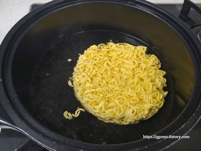 조리법은 먼저 냄비에 물부터 끓입니다. 레시피에 물 600ml라 하지만 어차피 버릴 물이기에 물양은 중요하지 않아요. 물이 끓으면 면을 넣고 4분 30초간 삶습니다.