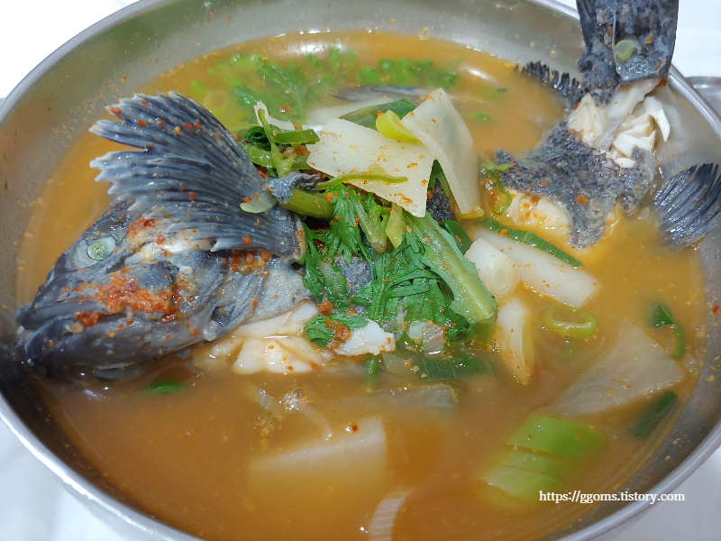 그리고 우럭매운탕이에요. 우럭매운탕이 1인에 한 그릇씩 나오더군요. 조그마한 우럭 한 마리가 통째로 들어 있습니다.