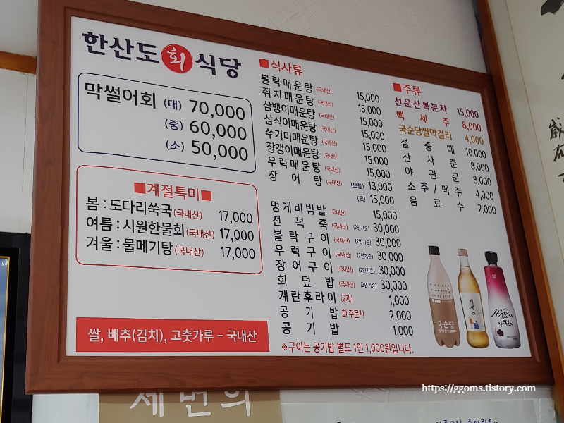 막썰어회(대) 70,000원, (중)은 60,000원, (소)는 50,000원
