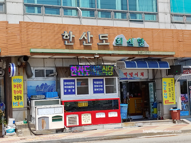 통영시 도천상가안길 18 동원나폴리빌에 위치한 한산도 회식당입니다.