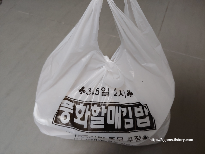 김밥은 돌돌 싸여 있고요. 국은 봉지에 넣어져 있고, 반찬은 플라스틱통에 넣어져 있어요.