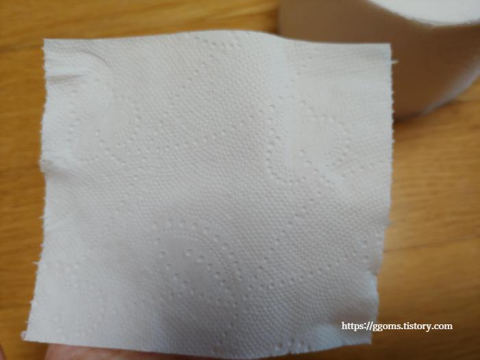 살짝 찢어짐은 있는 것 같고, 부드러움은 고가 고급 화장지에 비해 덜한 것 같아요. 하지만 그렇다고 아주 거칠거나 하지는 않아요. 적당히 쓸만한 것 같습니다. 가성비 좋은 천연펄프 화장지인 것 같아요.