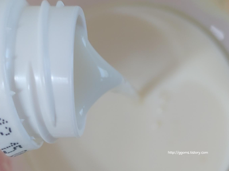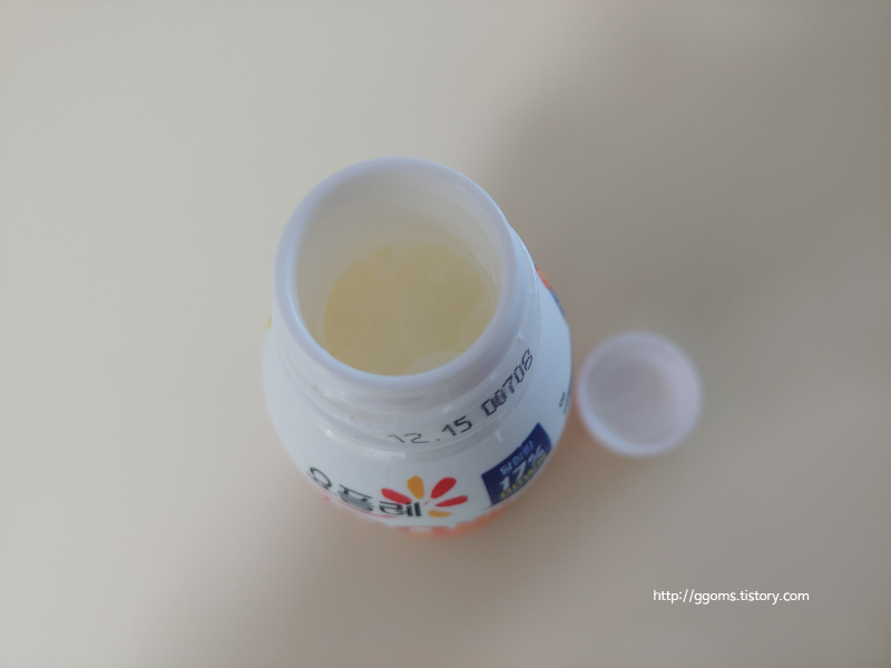 컵에 따라봤어요. 농도가 그렇게 진하지는 않은 듯, 많이 걸쭉하거나 하지는 않아요. 맛을 보니 적당한 단맛 돌고요. 고소한 맛도 나고 캡슐도 씹혀요. 그런데 캡슐 유산균이 장까지 살아가도록 하기 위해서 캡슐을 씹으면 안 되지요.