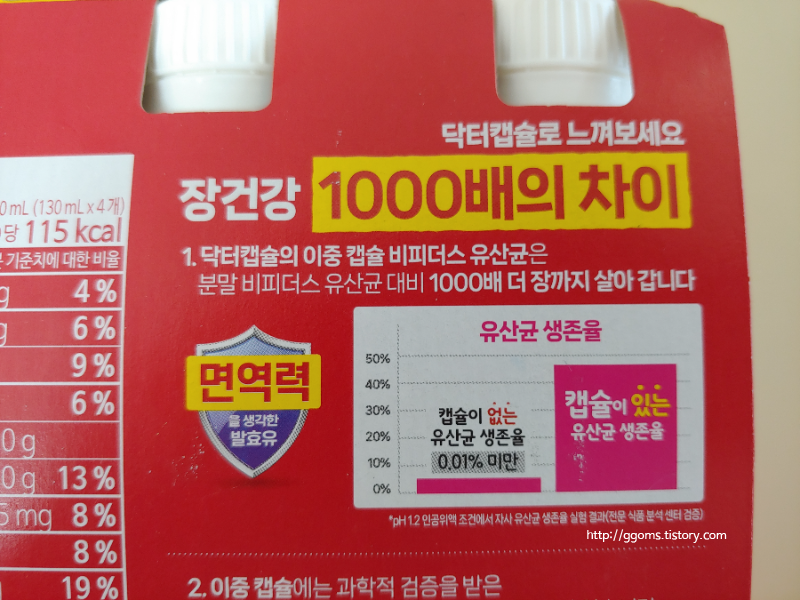 닥터 캡슐 요구르트는 유산균이 캡슐로 되어 있는 게 특징이지요. 닥터캡슐의 이중 캡슐 비피더스 유산균은 분말 비피더스 유산균 대비 1000배 더 장까지 살아간다고 합니다. 캡슐이 없는 유산균 생존율은 0.01% 미만이라고 해요.