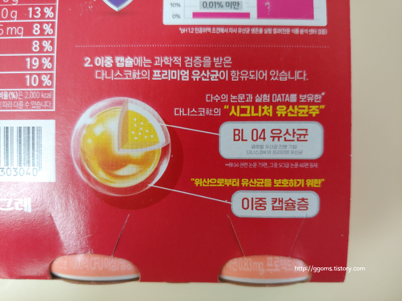캡슐 안에는 과학적 검증을 받은 다니스코사의 프리미엄 유산균인 BL 04 유산균이 함유되어 있다고 합니다.