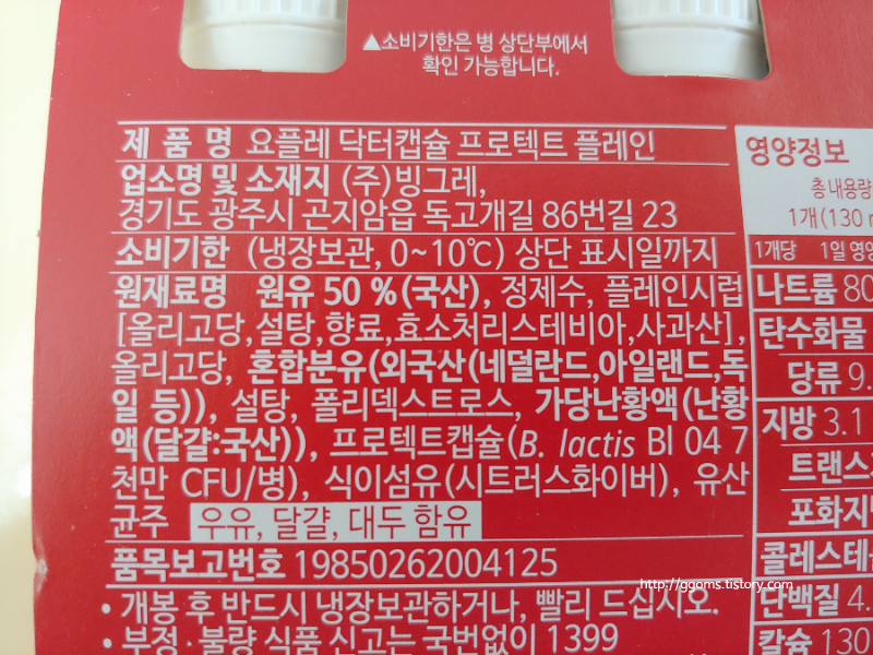 더 자세한 원재료명은 원유 50%(국산), 정제수, 플레인시럽[올리고당, 설탕, 향료, 효소처리스테비아, 사과산], 올리고당, 혼합분유(외국산(네델란드, 아일랜드, 독일 등)), 설탕, 폴리덱스트로스, 가당난황액(난황액(달걀:국산)), 프로텍트캡슐(B. lactis BI 04 7천만 CFU/병), 식이섬유(시트러스화이버), 유산균주