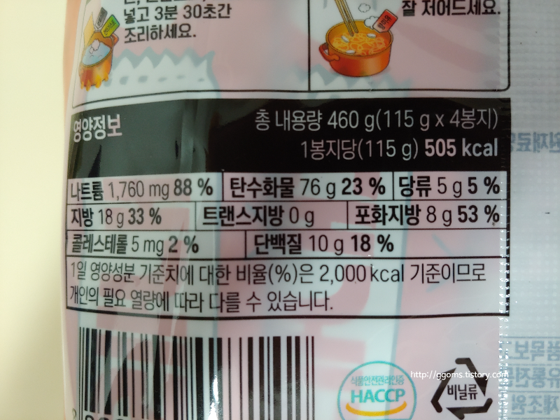 어쩌다사장 대게라면 영양성분입니다, 1봉지 중량은 115g이고요. 칼로리는 505kcal, 나트륨 함량은 1,760mg, 탄수화물 76g, 당류 5g, 지방 18g, 트랜스지방 0g, 포화지방 8g, 콜레스테롤 5mg, 단백질 10g.