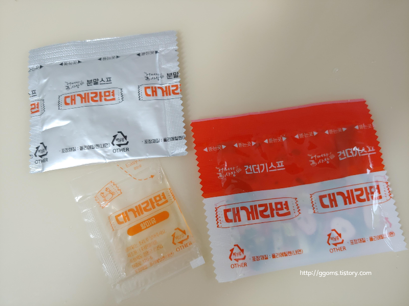 스프류는 세 종류가 들어 있어요. 건더기스프와 분말스프, 그리고 향미유가 있습니다.