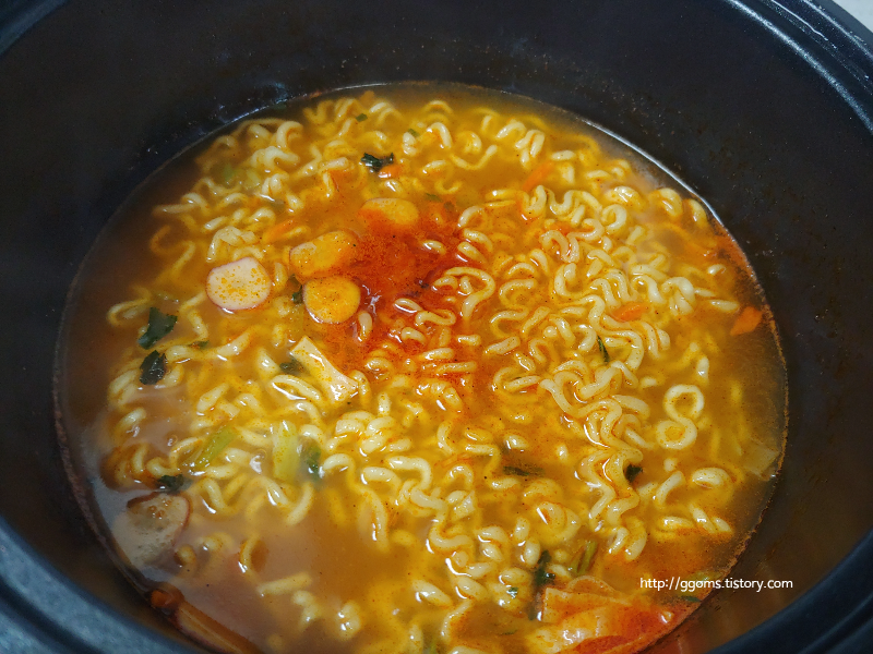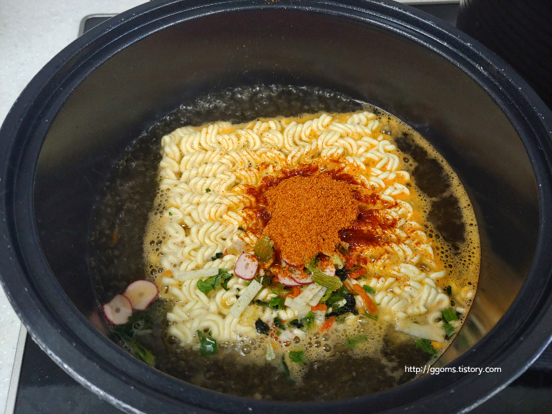 불을 끄고 마지막에 향미유를 넣어 잘 저어 먹으면 됩니다. 일단 냄새는 너구리 라면 냄새가 조금 나는 것 같더라고요.