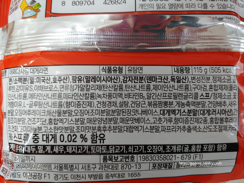 원재료명은 다양한 성분들이 들어 있는데요. 대게 라면이니 대표적인 원재료가 대게엑기스분말인 것 같아요.